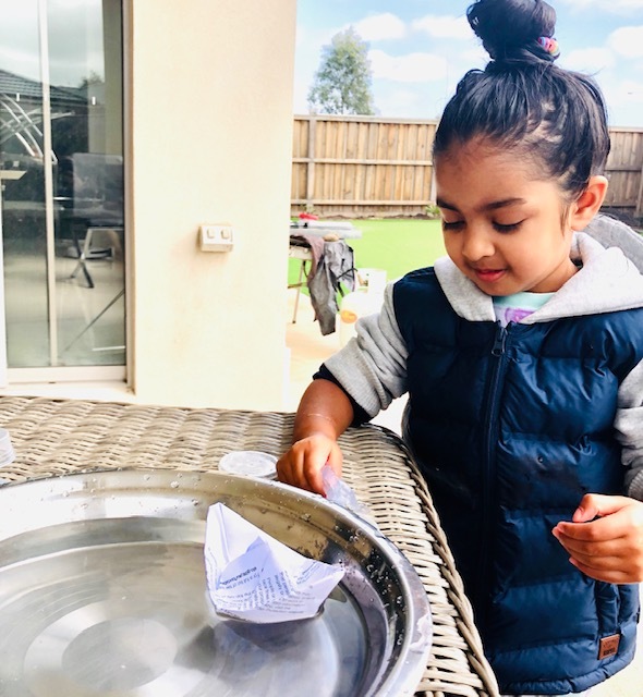 First, we conducted a class experiment on Zoom, where the girls were asked to bring a tub of water and a few items. The girls took turns predicting whether the item would sink or float by showing their thumbs up or down. Our results were recorded, and then the girls were instructed to get to work creating their very own floating device. Each device was unique, with the girls using a range of different resources from sponges, boxes, toilet rolls and paper for their creation. Some girls ran into trouble when their boats got a leak in them, got wet or even sank!