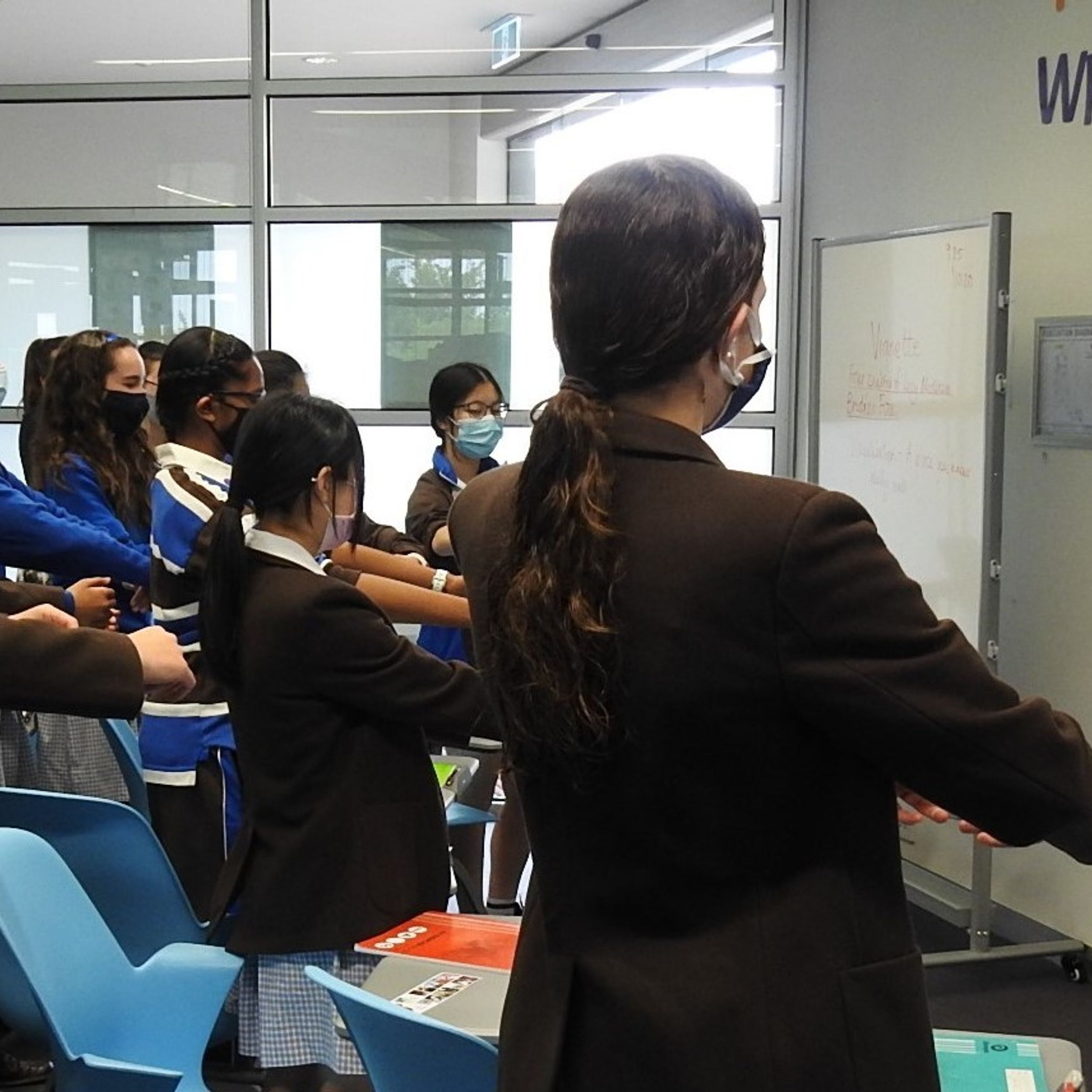 To get the ball rolling, Kirsty asked students to writing continuously for three minutes. No overthinking, no eraser, "hot" writing. Kirsty invited a "wolf" into the classroom. It was two metres high, named by the students and it roamed around the classroom nibbling fingers if anyone dared to stop writing. Kirsty explained this wolf was a physical manifestation of a writer’s fear of getting started or writer’s block. It was a frenzied three minutes, as no-one ventured to stop.